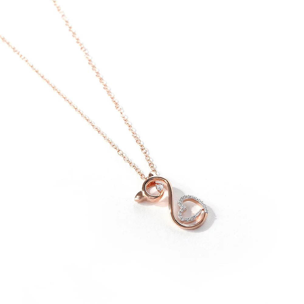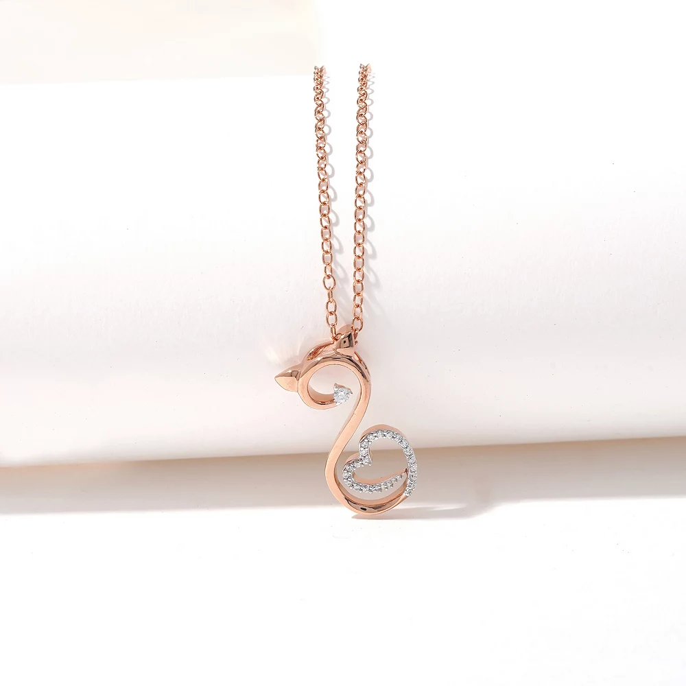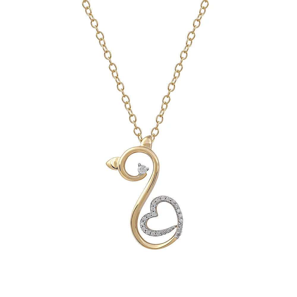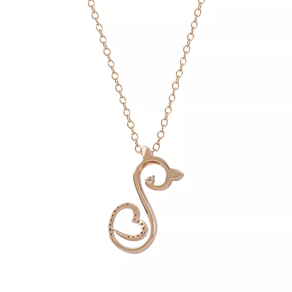 This stylized DeCouer cat pendant is an instant charmer, made with sparkling diamonds and sterling silver to outline the cat’s head, body, and gracefully curved tail forming a heart.