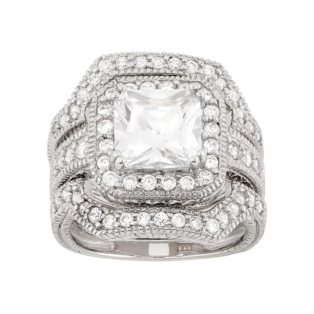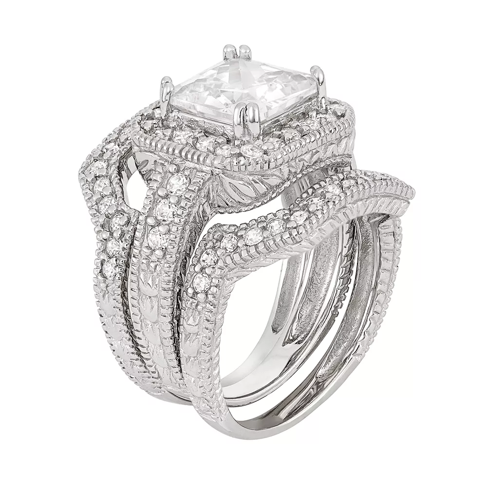 Adorned with a princess-cut cubic zirconia center stone surrounded by round-cut cubic zirconia accents, this sterling silver halo engagement ring showcases your love in an awe-inspiring way. Complete with two shadow wedding bands covered in cubic zirconia accents and miligrain detailing, this engagement ring set is completely captivating.