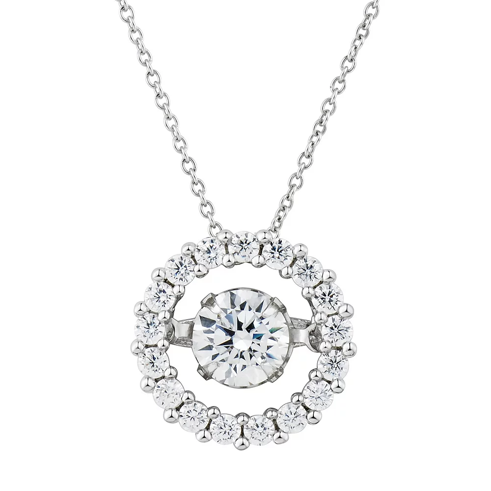 Featuring a circle pendant adorned with round-cut simulated diamonds, this sterling silver circle necklace is completely captivating. Floating DiamonLuxe pendants have a unique setting that keeps the center stone in constant motion, providing endless brilliance.