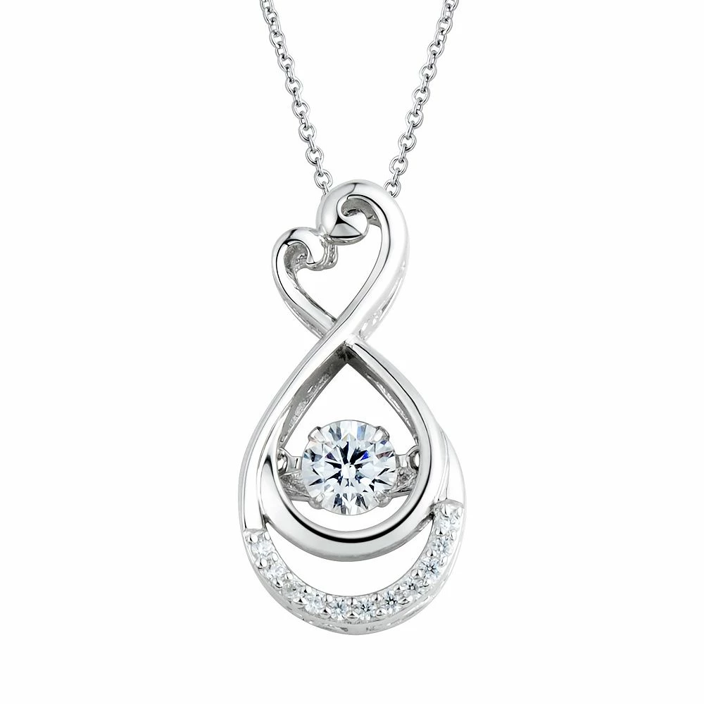 Decorated with an intertwined infinity and heart design highlighted with simulated diamond accents, this sterling silver pendant enhances your look with eye-catching sparkle. Floating DiamonLuxe pendants have a unique setting that keeps the center stone in constant motion, providing endless brilliance. Comes in a gift box.