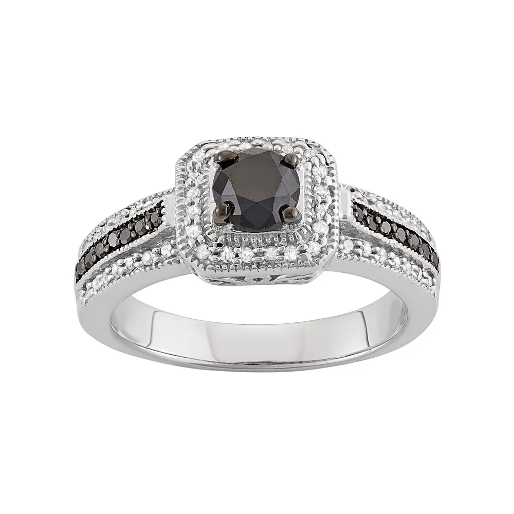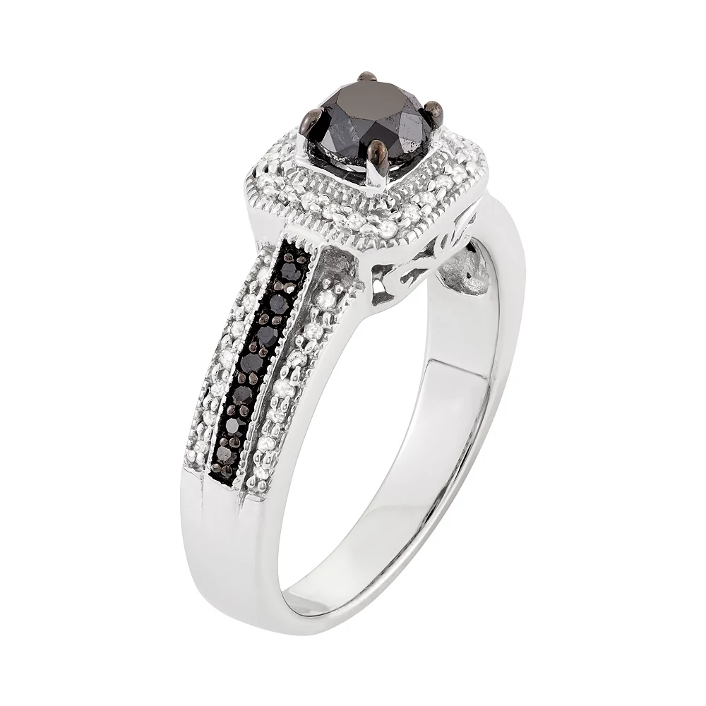Grace yourself with the scintillating style of this black and white diamond ring. With a round-cut black diamond center surrounded by rows of black and white diamonds in a square halo design, this sterling silver ring is an exquisite choice.