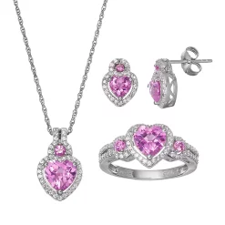 Adorn yourself in the beauty of this sterling silver necklace, ring and earring set. Heart-cut, lab-created pink sapphire stones lend feminine allure, while lab-created white sapphire stone frames add extra sparkle. Open-worked settings complete the look. Comes in a gift box.