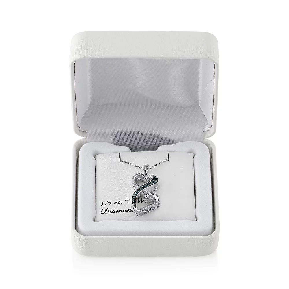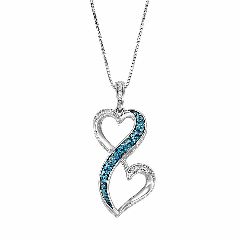 A double heart pendant accentuated with round-cut blue and white diamonds gives this sterling silver necklace breathtaking beauty. Comes in a gift box.