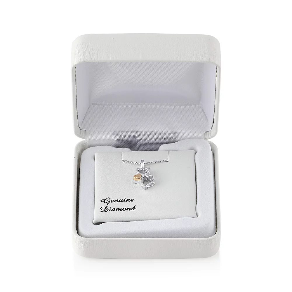 Featuring an intertwined heart design accentuated with diamonds and a 10k gold heart, this pendant is simply delightful. Comes in a gift box.