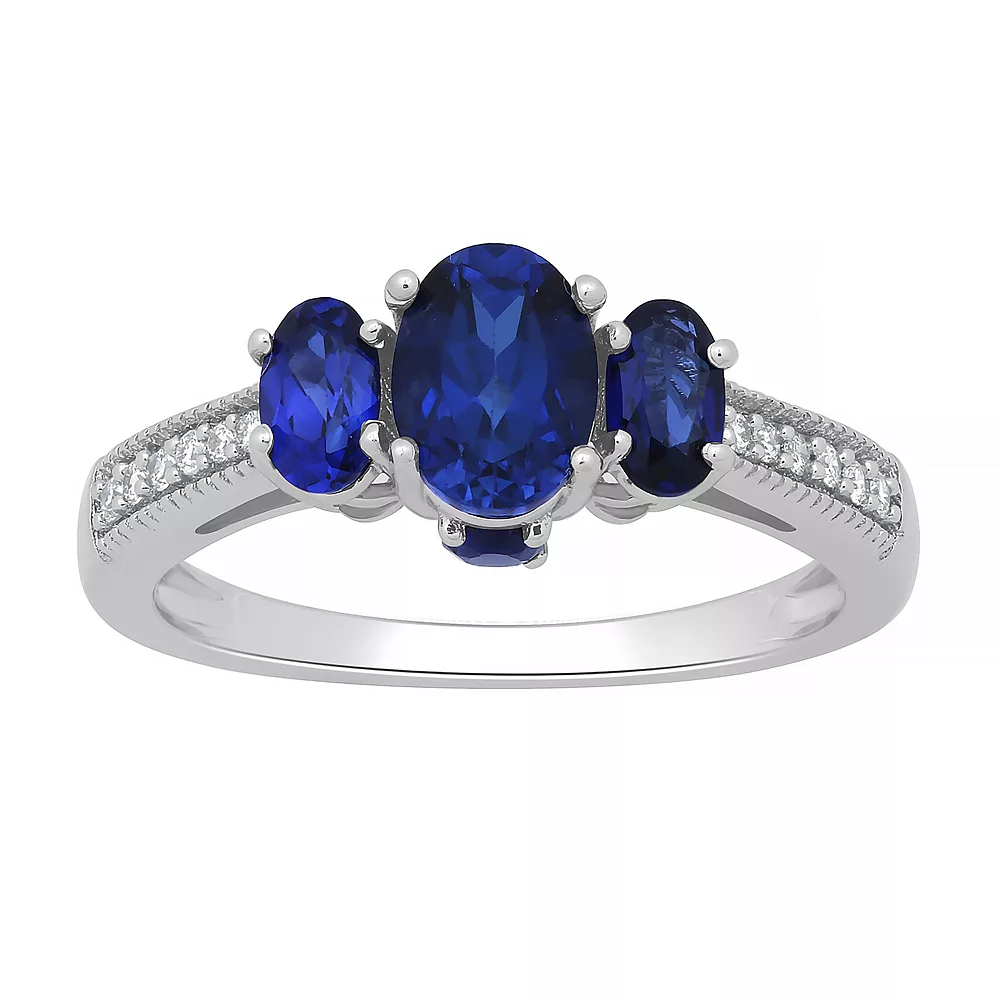 Adorned with lab-created sapphires and lab-grown diamonds, this Made For You three-stone ring is altogether captivating.