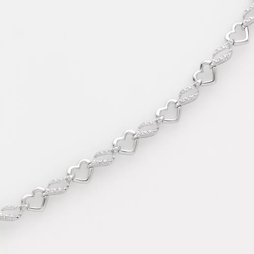 Sweet and chic. Heart links and round-cut diamonds make this bracelet a lovely choice. Surprise someone special with this sterling silver bracelet and a pair of diamond studs.