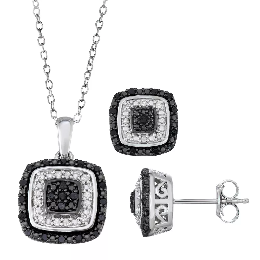 You’ll love the bold style of this fashionable sterling silver black and white diamond pendant and earring set.