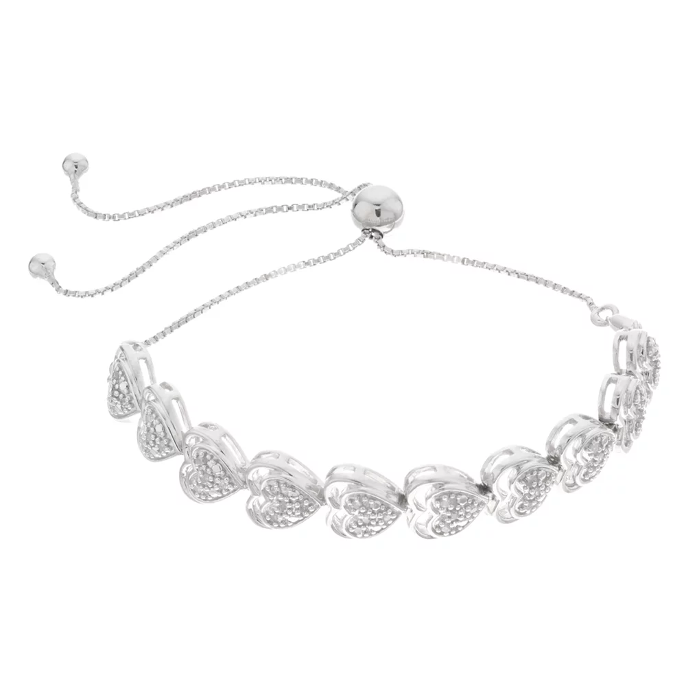 Heart links and round-cut diamonds make this sterling silver bracelet a lovely choice.