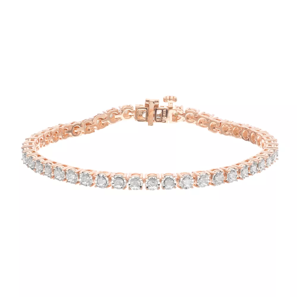 Adorned with shimmering diamonds, this sterling silver tennis bracelet is a sparkling accessory you’ll love.
