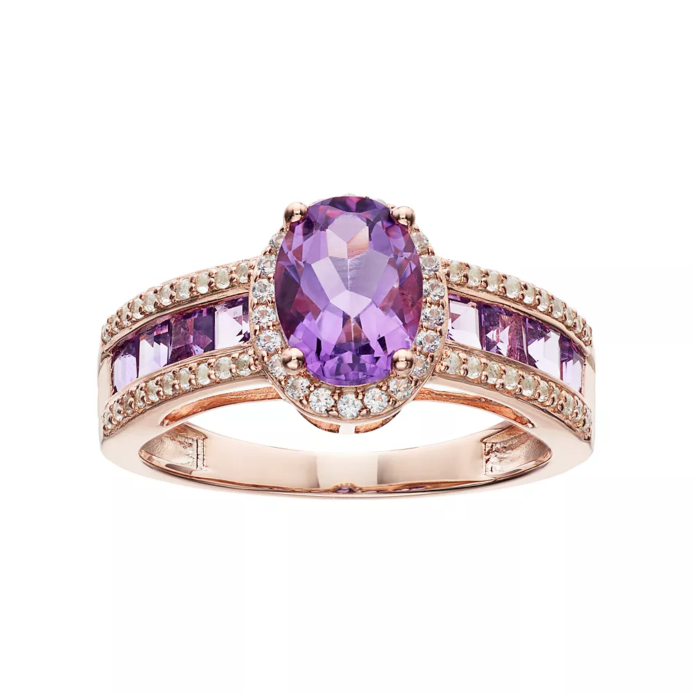 Featuring an oval-cut genuine amethyst center stone wrapped in lab-created white sapphire accents, this halo ring provides scintillating style. Further accentuated with princess-cut genuine amethyst and round-cut, lab-created white sapphire stones along the band, this ring draws attention from every angle.
