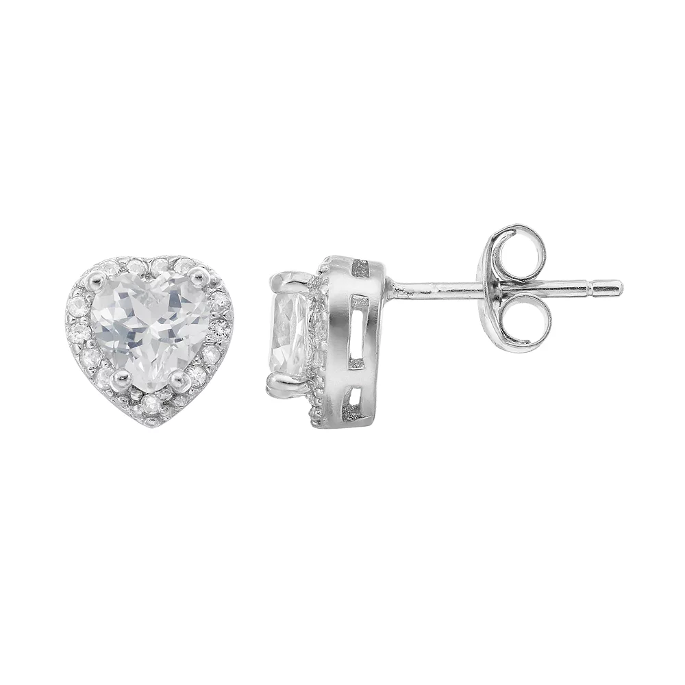 Featuring heart-shaped, lab-created white sapphire stones and shimmering diamond accents, these sterling silver stud earrings make a lovely accessory.