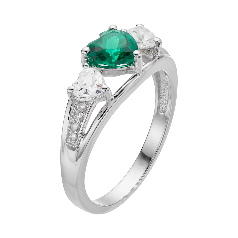Dazzling with a simulated emerald center stone and lab-created white sapphire accents, this sterling silver ring abounds with feminine beauty.