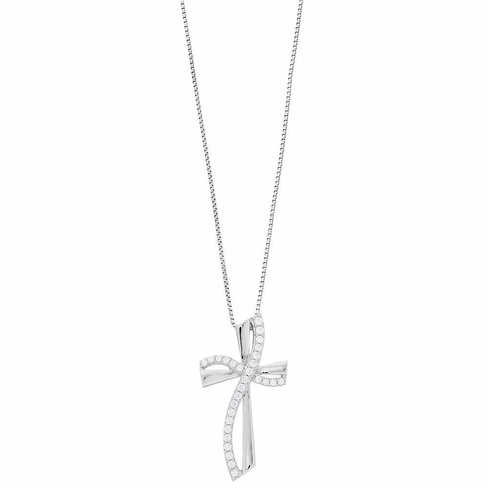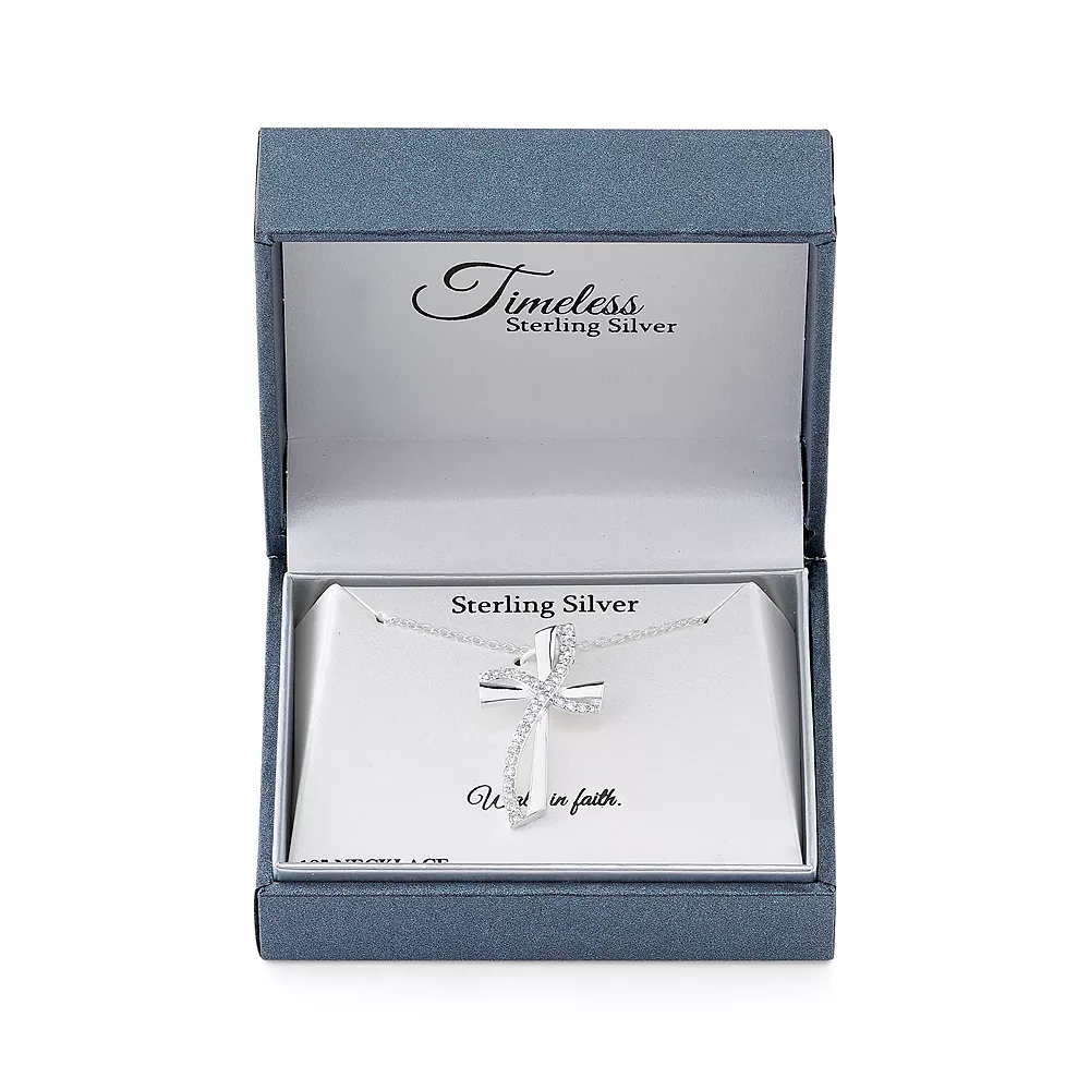 Adorned with CZ accents, and featuring a distinctive swirl design, this Timeless Sterling Silver cross pendant is simply divine.