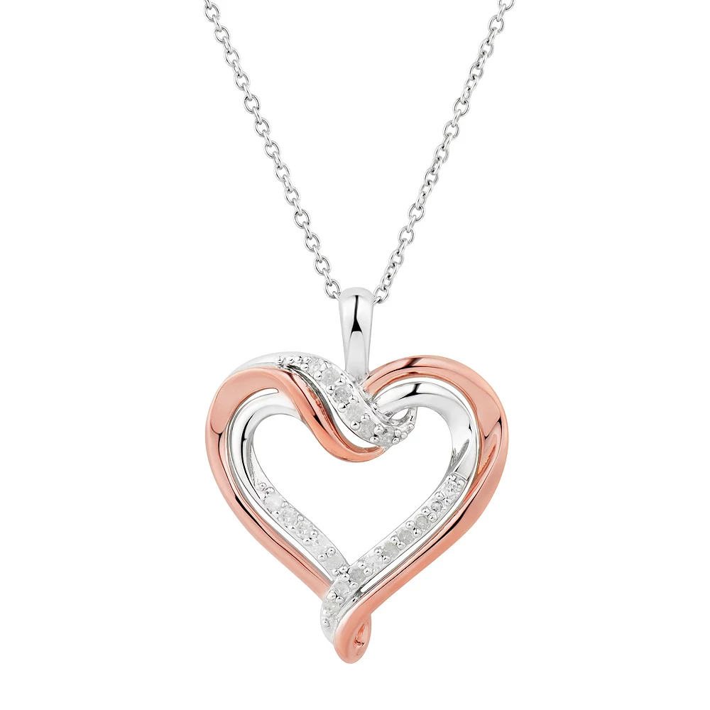 Shimmering diamonds and a double-heart design make this two-tone pendant a captivating choice.